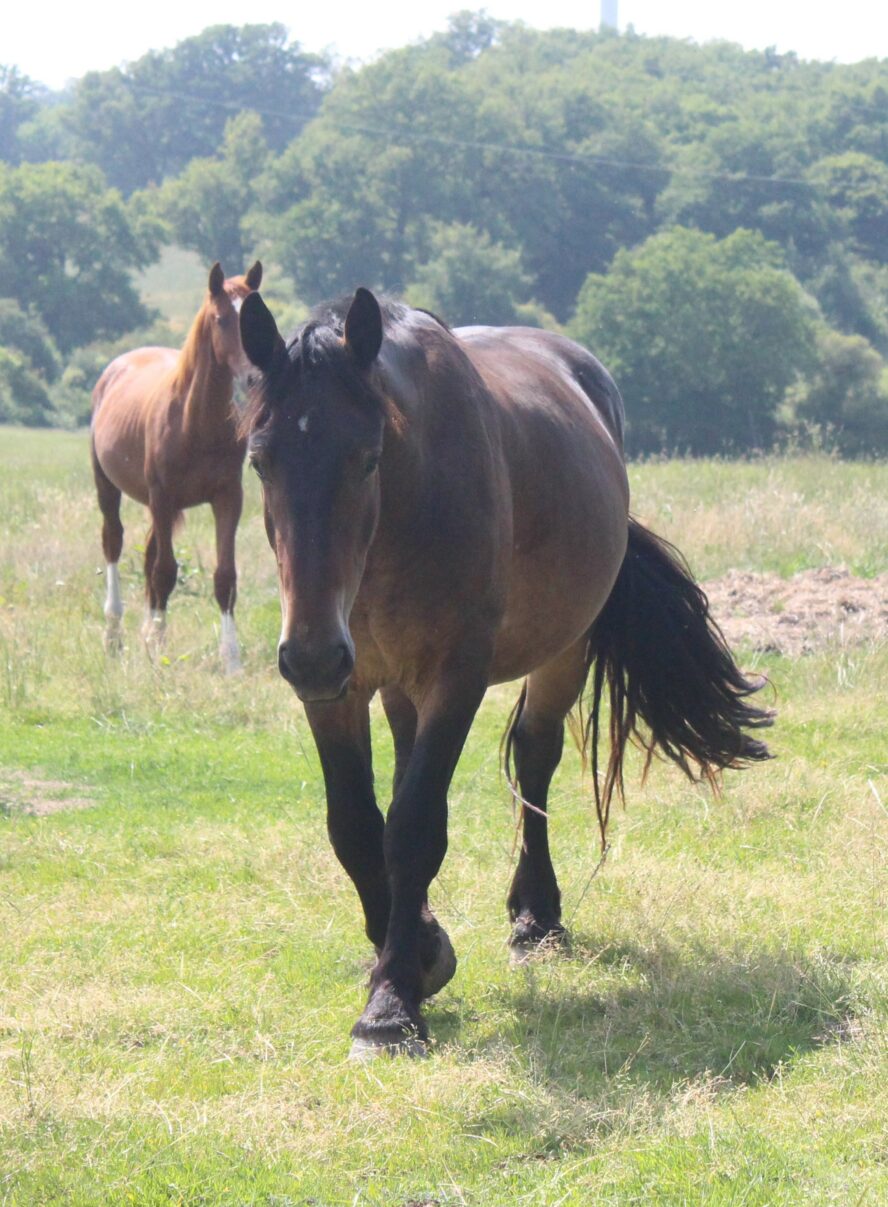 Premier poulain de Féline et Bhaiti Jed, il est costaud. Nous espérons qu’il fera un super cheval de randonnée. Né en 2022, il est déjà aussi grand que sa mère (à droite sur la photo).