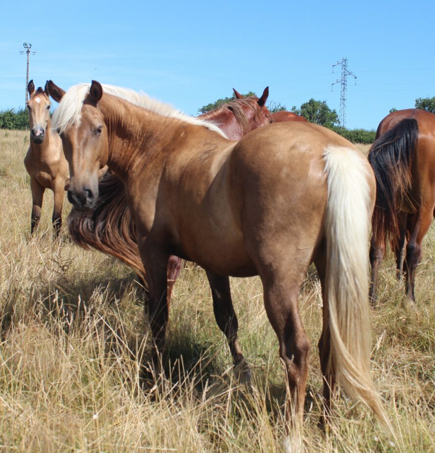 Jolie pouliche palomino de 2022, par Queenee West Indies et Bhaiti Jed. Elle est née chez nous, proche de l’homme et affectueuse.
