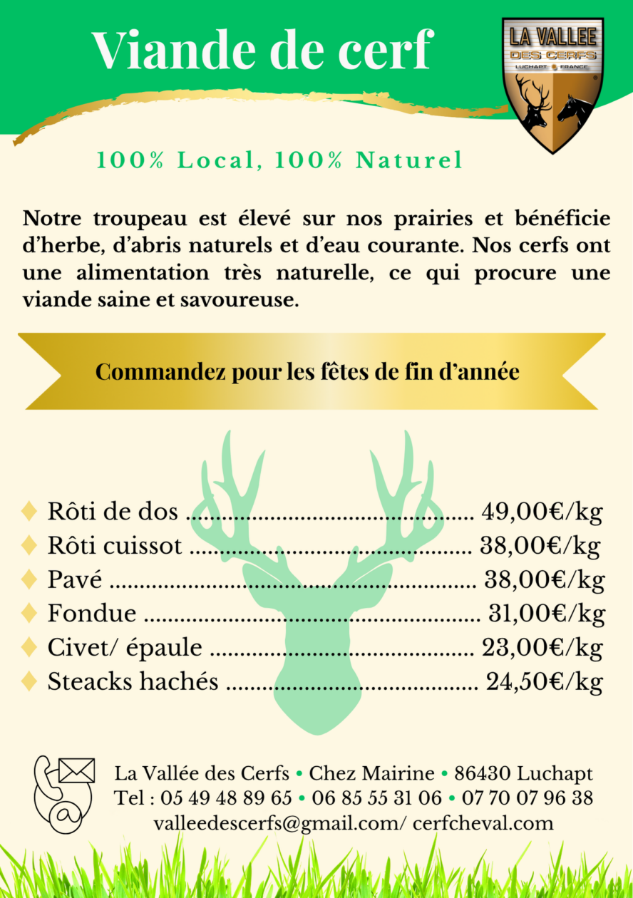 Ils sont principalement élevés pour être vendus au parc d’élevage ou pour la viande. Pendant l’hiver de succulents rôtis accompagnés d’une sauce égayeront vos repas de fête. Toute l’année nous vendons nos terrines à base de viande de cerf faites maison.