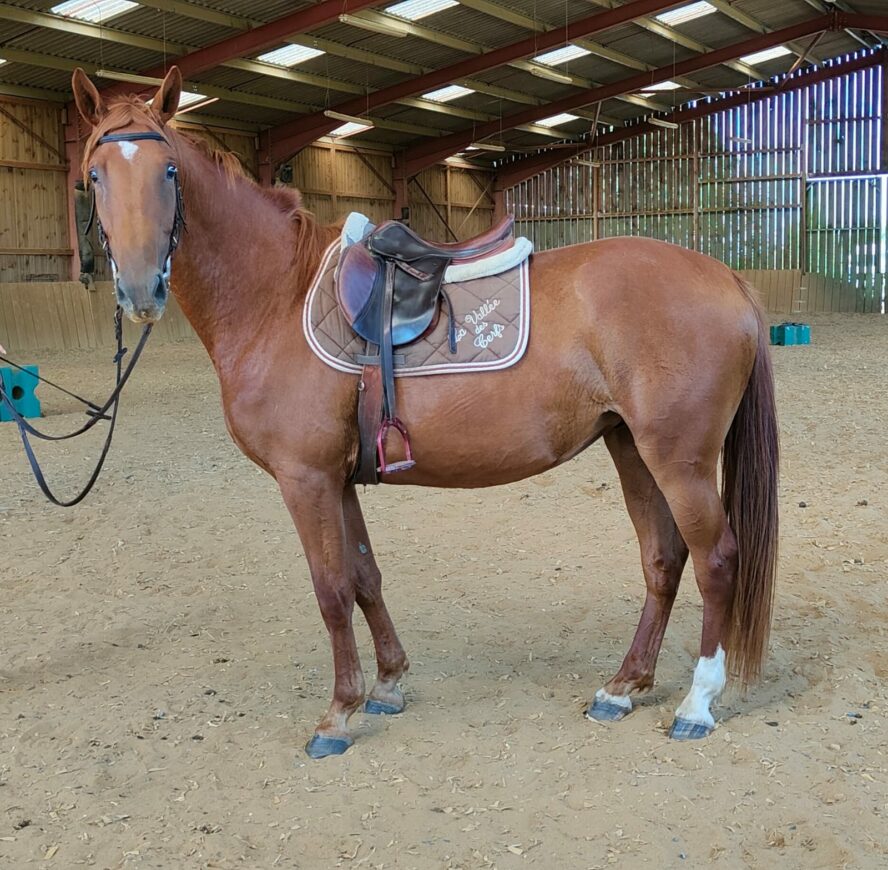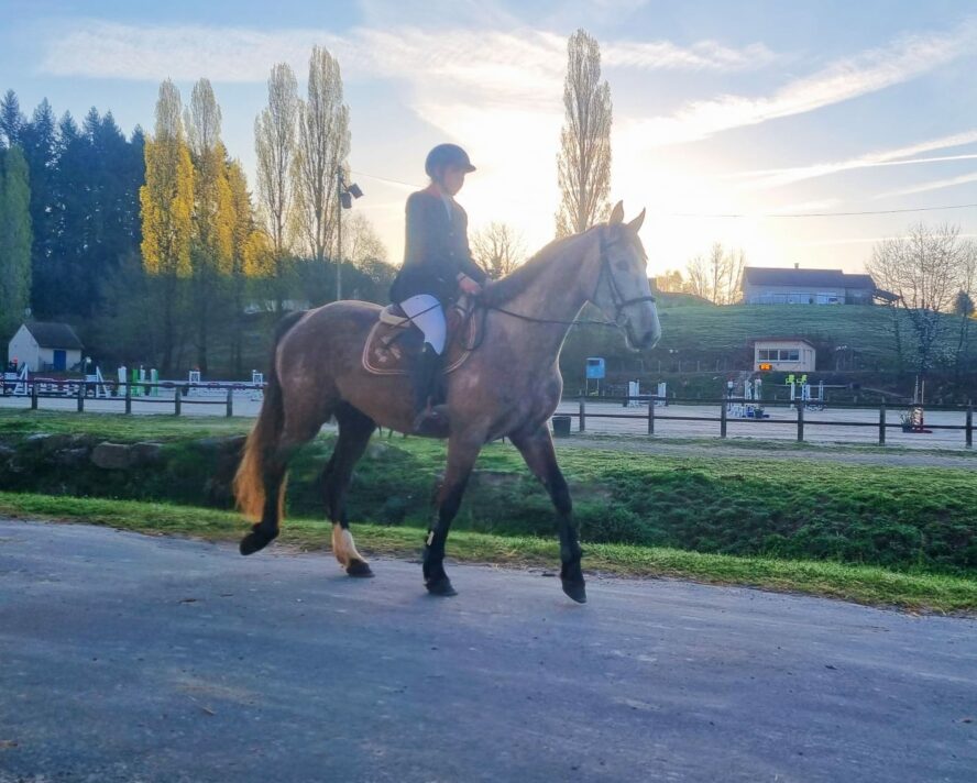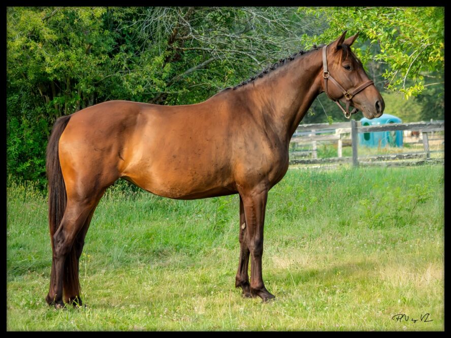 Née chez nous en 2016, premier produit de la ferme. Elle a déjà participer à des concours de CSO à 1,10m, elle est de Ode Pierreville et Contendro. Elle est la demi-soeur d’Istoire de l’Isop. Elle a repris le travail fin 2025, après nous avoir fait un joli poulain Orazio de l’Isop.