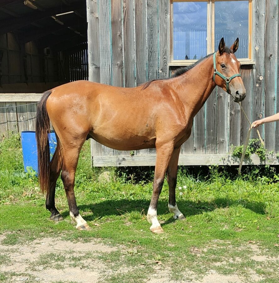 Hongre né en juillet 2022, par Royal Escort Clamens et Colore. Il est gentil, débourré il y a peu il continue le travail.