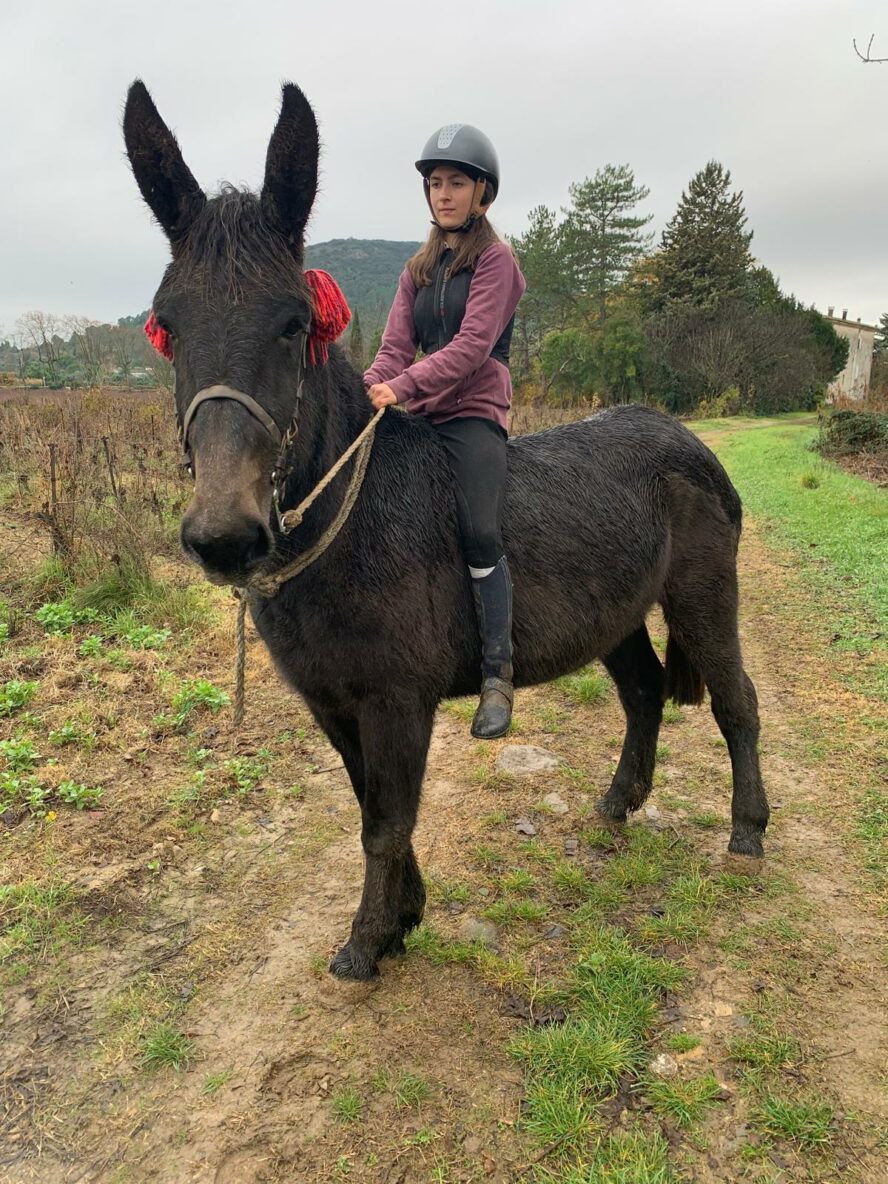 La première mule qui est arrivée à la ferme. J’avais envie de découvrir le monde des mules et j’étais bien servie avec elle. Au début c’était vraiment difficile mais petit à petit elle s’est laissée attraper et maintenant ça va beaucoup mieux. Elle a été baté mais actuellement elle est à la retraite et tient compagnie au poneys.